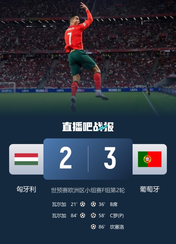 两连胜!葡萄牙3-2匈牙利 C罗点射成为世预赛射手王坎塞洛B席传射
