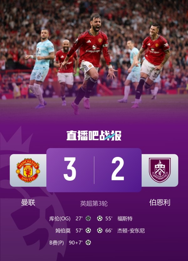 本轮英超,曼联险胜伯恩利,本场姆伯莫破门,B费补时点杀,曼联取得联赛首胜。