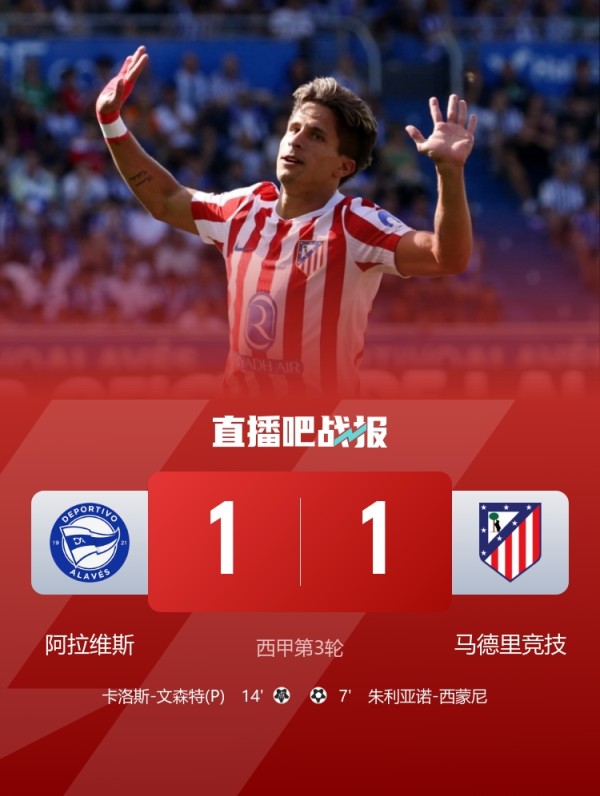 马竞1-1战平阿拉维斯,球队赛季开始后三轮不胜,本场朱利亚诺-西蒙尼破门。